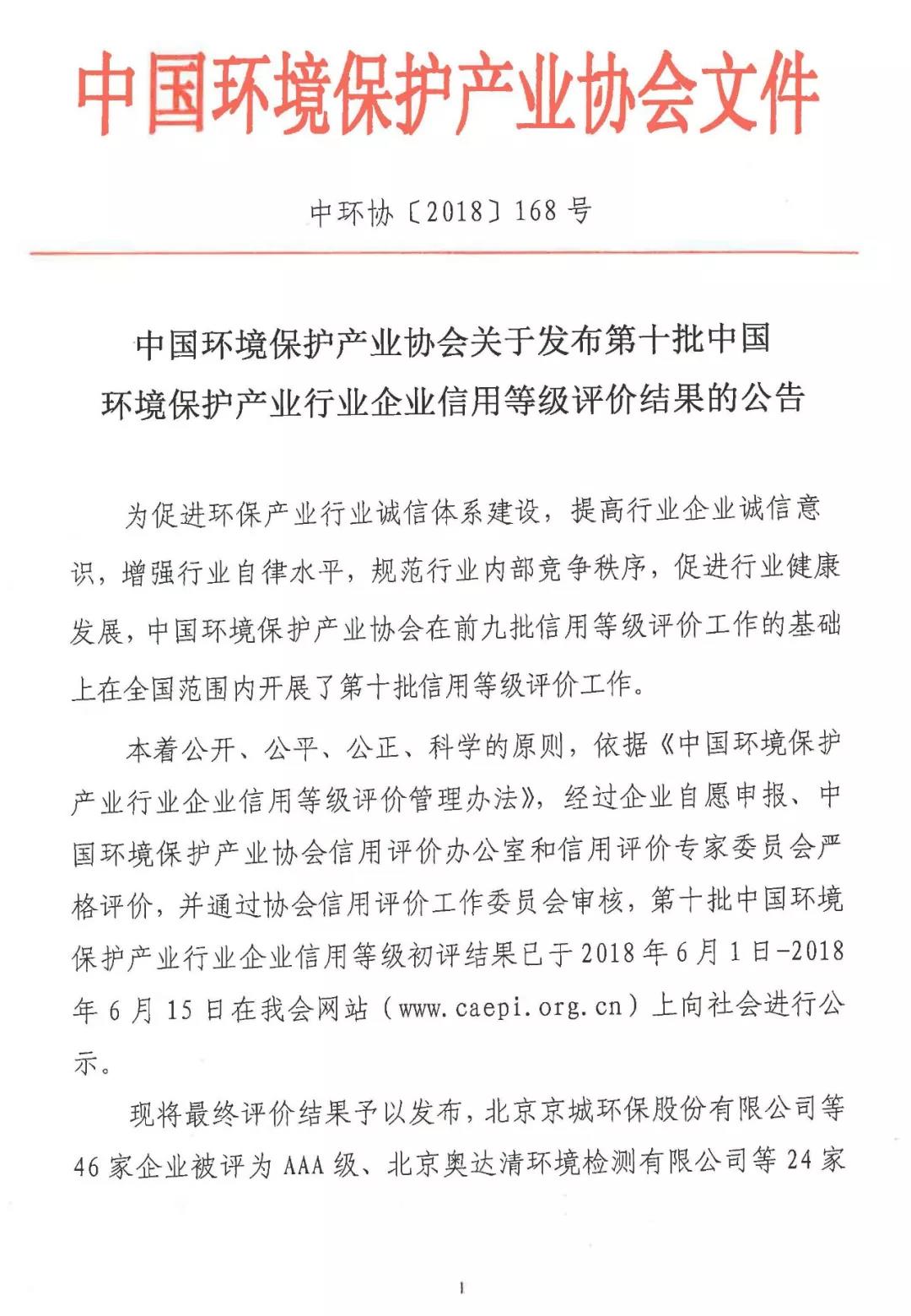 久科环保获中国环境保护产业协会企业信用等级评价AAA评级