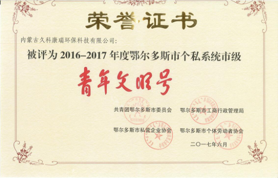 会上,久科环保被评为2016-2017年度鄂尔多斯市个私系统市级青年文明号。青年文明号的设立旨在营造青年创新创业的良好氛围,树立青年创新创业光彩榜样,彰显鄂尔多斯新青年的时代风貌,激励全市各界青年积极投身社会经济建设,为建设文明和谐鄂尔多斯作出新的更大的贡献。