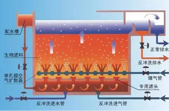 曝气生物滤池特点曝气生物滤池集生物氧化和截留悬浮固体于一体节省后续二次沉淀池和污泥回流,在保证处理效果的前提下使处理工艺简化。曝气生物滤池具有容积负荷高、水力负荷大、水力停留时间短、所需基建投资少、占地面积小、处理出水水质好等特点,又由于曝气生物滤池没有污泥膨胀问题,微生物不会流失,能保持较高的生物浓度,因此日常管理简单。